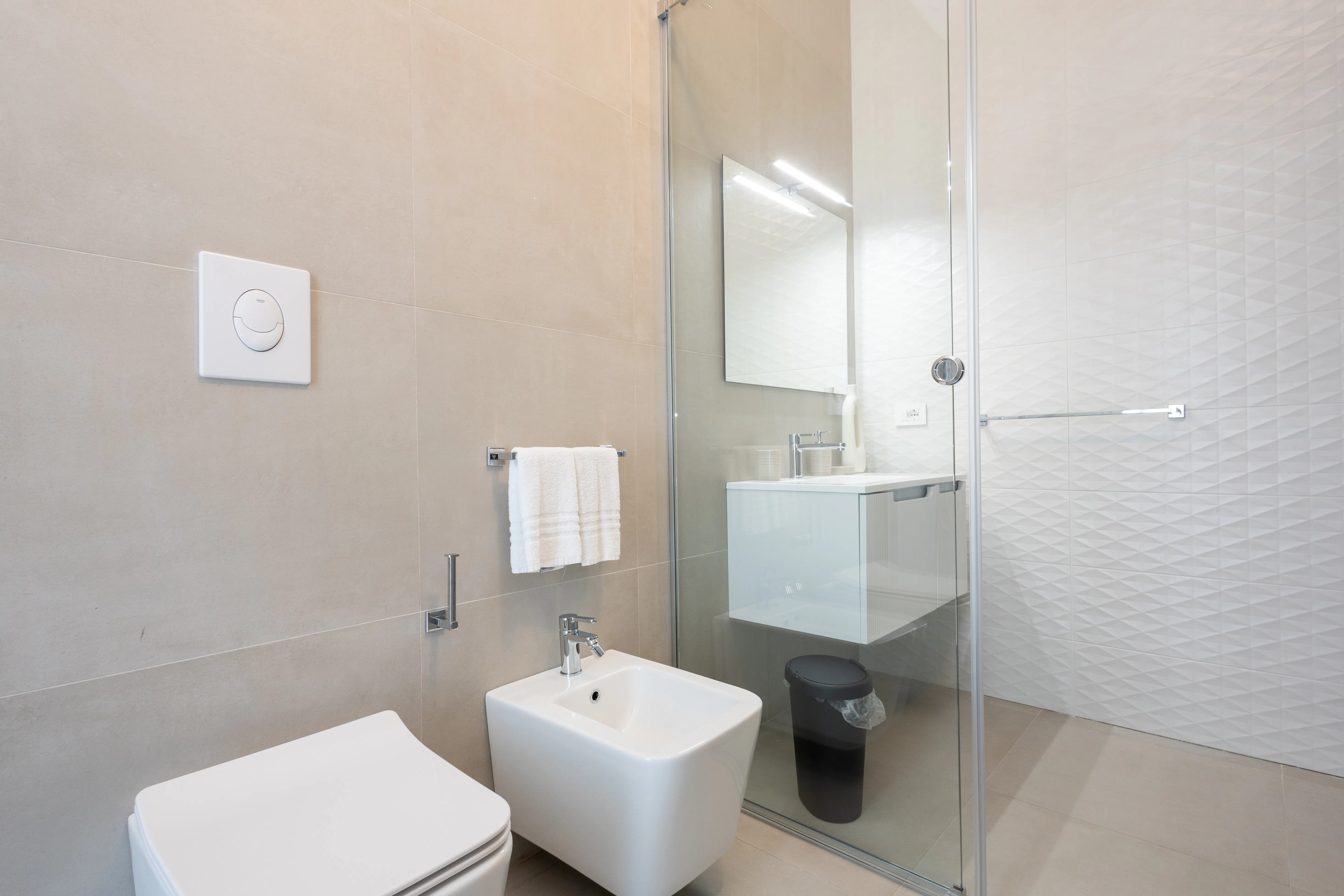 Inside, contemporary design meets homelike warmth — a fully equipped kitchen, cozy air-conditioned rooms, and a private bathroom with a spacious shower and complimentary toiletries. Every detail is crafted to make you feel at home, surrounded by elegance and simplicity.